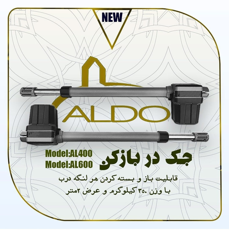 جک آلدو، تولید ایران میباشد،دارای نشان استاندارد ایران و برای درب های بسیار تا ۲.۵ متر و وزن ۲۵۰ کیلو گرم هر لنگه کاربرد دارد. جک آلدو قابلیت نصب در محیط های مرطوب و فضای باز را دارد چرا که کاملا پلمپ بوده و از نفوذ آب و گرد غبار در امان است.