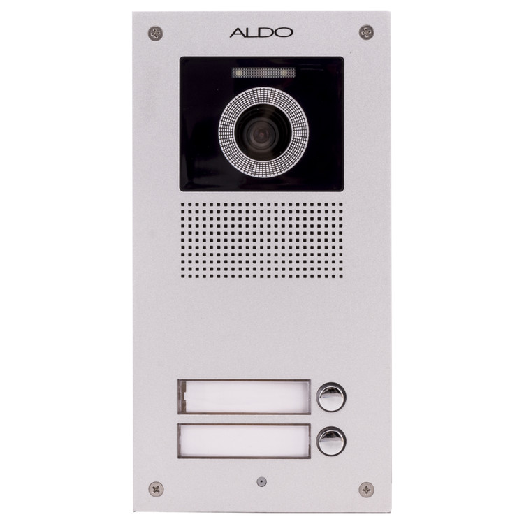 پنل 2واحدی آیفون تصویری آلدو ساده مدل AL-NUDC محصول کشور ایران و همچنین این پنل دم درب یکی از پرفروشترین پنل های آیفون تصویری های موجود در بازار میباشد در طراحی این پنل از سادگی و در عین حال کارایی بالا استفاده شده است . در قسمت بالایی این پنل دوربین و چراغ های دید در شب تعبیه شده است .برد و میکروفن و همچنین بلند گو وشاسی های زنگ نیز به شکل زیبایی در پایین پنل قرار گرفته اند . این پنل در عین سادگی بسیار زیبا و کارآمد نیز میباشد .